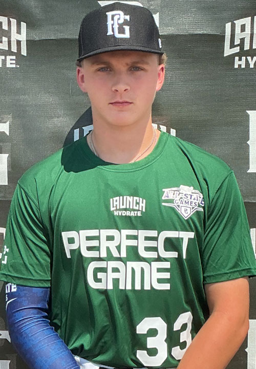 Colton Wilson is a 2027 3B/RHP with a 6-2 180 lb. frame from Prosper, TX who attends Walnut Grove High School. Primary 3B with a physical frame and good strength in it. Profiles well on the corner. Waits back on the ball a bit but fields it cleanly with good hands. Shuffles into his throws and was up to 74 from across the diamond with accuracy. Uses a 2 hand gather and funnel working up the middle. Also pitched throwing from a higher 3/4 slot. Fastball worked up to 82 and was located well with good life. Went to a curve with healthy 11-5 shape and could drop it in. Works downhill and lands inline well repeating mechanics. Velo should trend up. Right-handed hitter with a wider base and high handset. Simple swing with good developing bat speed. Good feel to catch it out front and get extended. Consistently on the barrel with good feel for it. Can impact it when timed up. Should continue to get better on both sides of the ball. Good Student.