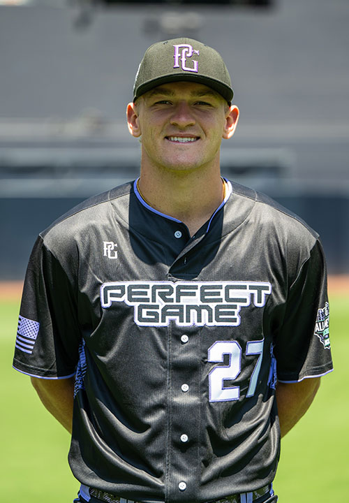 Ryan Harwood is a 2026 OF/RHP with a 6-3 205 lb. frame from Chandler, AZ who attends Casteel. Outstanding athletic build with present strength and plenty of projectability remaining. Left handed hitter, sets up in a slightly spread stance with a well-timed shift and stride into contact, whips and drives the hands hard and creates outstanding bat speed, pull side approach with big power when he gets extended, almost everything over 100EV in batting practice, controlled the barrel well, high level hitting potential. 6.65 runner in the sixty. Primary outfielder on defense, moves to the ball well and fields it out front with a clean gather and easy shuffle into his release, has good arm strength, solid fundamental actions that he repeats well. Outstanding student. Verbal commitment to Texas A&M. Selected to play in the 2025 Perfect Game All-American Classic.